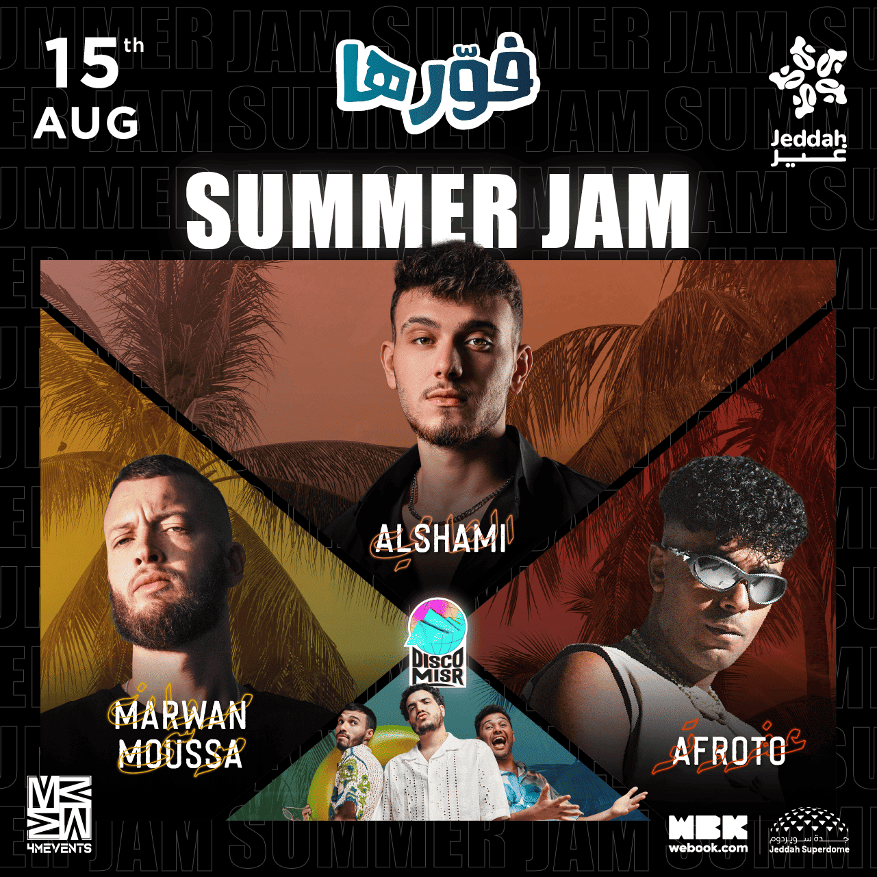 حفلة استثنائية مالها شبيه ضمن حفلات موسم جدة! فورها Summer Jam الحفل الاضخم على الاطلاق. لاول مرة الشامي في المملكة العربية السعودية. ولاول مرة يحيي مروان موسى حفل في جدة. وعفروتو محبوب الجميع حيكسر الدنيا. وديسكو مصر جايين بجنانهم عشان يولعوا الدنيا. يوم الجمعة 15 اغسطس في جدة سوبردوم. لا تفوت الفرصة واحجز تذكرتك الان!