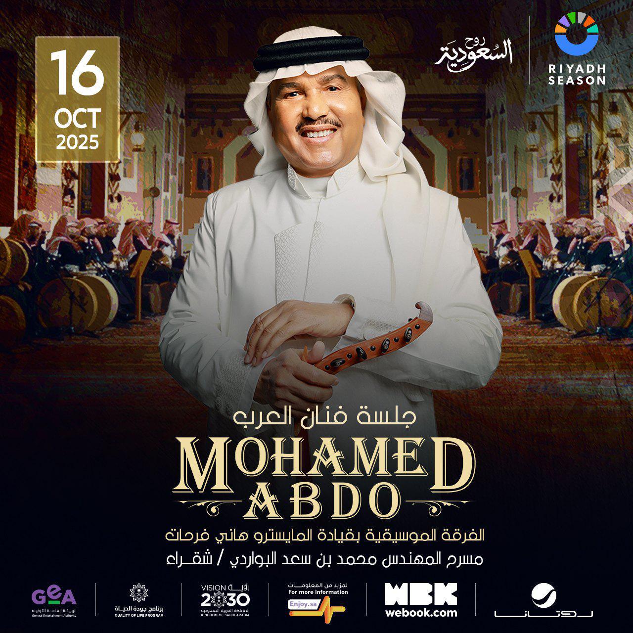 جلسة فن وطرب مميزة ومختلفة بكل تفاصيلها تجمعكم مع فنان العرب محمد عبده في شقراء في مسرح المهندس محمد بن سعد البواردي ليلة ١٦ اكتوبر لا تفوتوا أجمل لحظات الطرب في هذه الجلسة