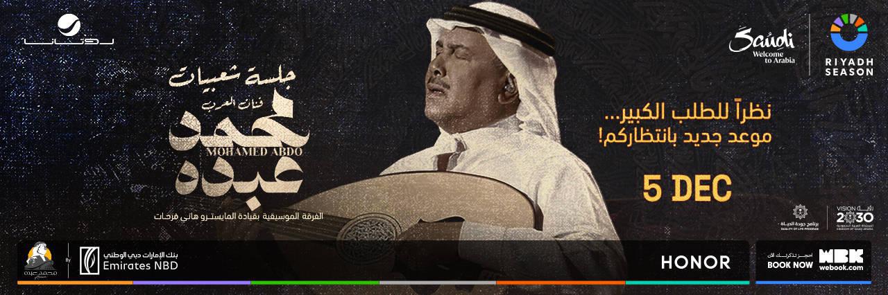 عِش روعة الموسيقى مع الأسطورة محمد عبده في الرياض – 5 ديسمبر استعدوا لليلة لا تُنسى مع فنان العرب محمد عبده، حيث يُطل عليكم مباشرة على مسرح الرياض في 5 ديسمبر، بمصاحبة المايسترو العالمي هاني فرحات. عِش أجواءً ساحرة مليئة بالأغاني الخالدة والأداء الاستثنائي الذي أسر قلوب الملايين في العالم العربي. هذه الحفلة هي فرصة ذهبية لعشاق الطرب الأصيل للاستمتاع بصوت أيقوني يروي تاريخ الفن العربي. احجز مقعدك الآن لتكون جزءًا من هذه الأمسية المميزة، حيث تمتزج الألحان الفاخرة مع أجواء الرياض النابضة بالحياة في ليلة واحدة من العمر.