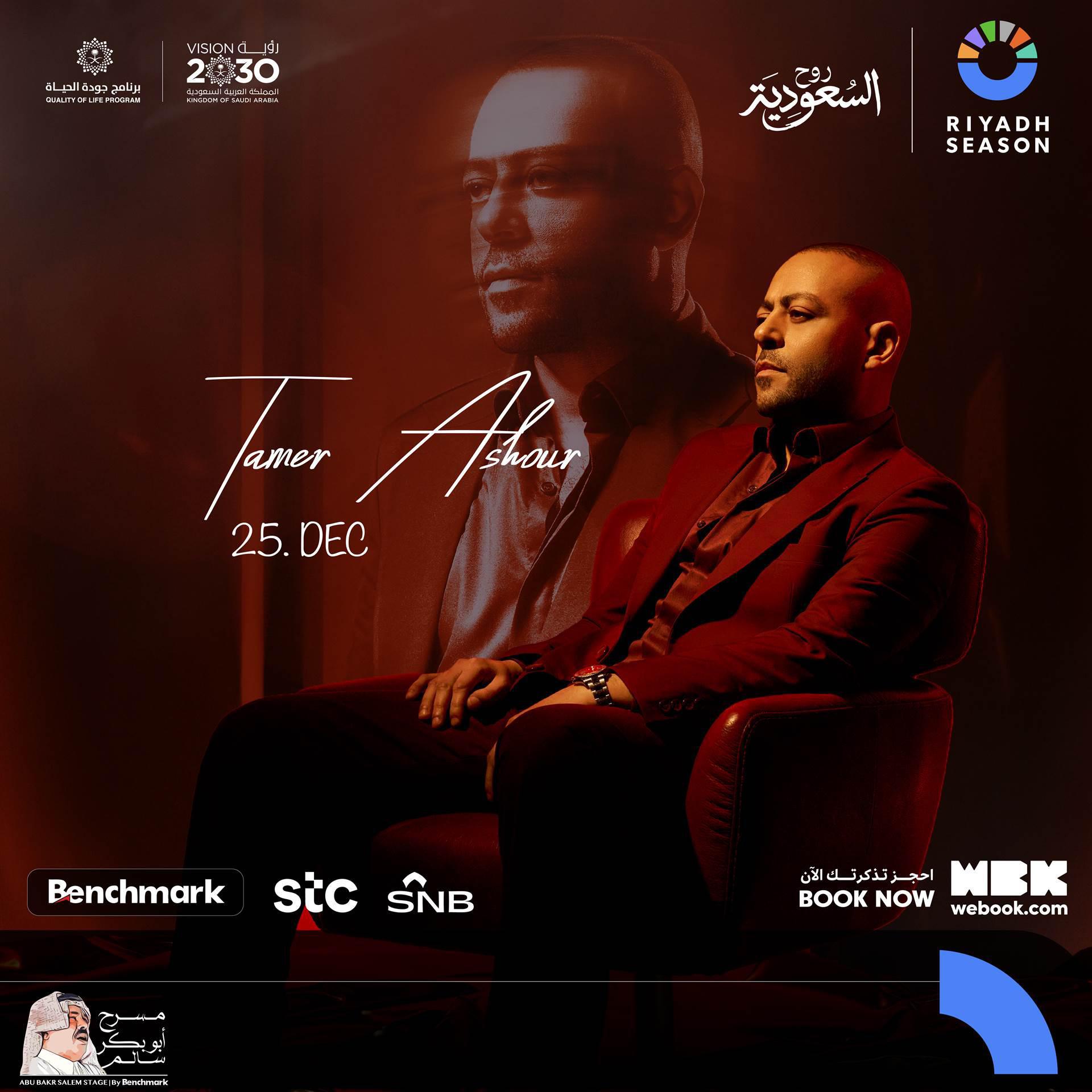 استعدّوا لحفلة مليانة إحساس وصوت ماله مثيل ✨ مع الفنان تامر عاشور في ليلة رح تكون من أجمل الليالي 😍 📍 الرياض - مسرح أبو بكر سالم احجز تذكرتك الآن و جهز نفسك لليلة ولا اروع!