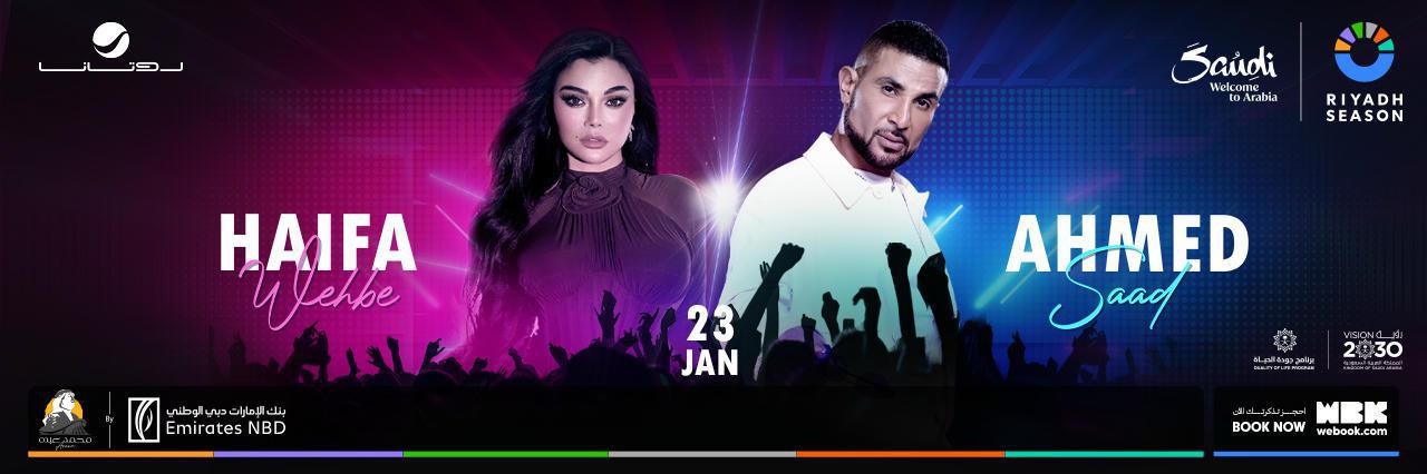 استعدوا لأمسية فنية لا تُنسى تجمع اثنين من ألمع نجوم الغناء العربي، هيفاء وهبي وأحمد سعد، في حفل غنائي ضخم يُقام يوم 23 يناير 2026 على مسرح محمد عبده أرينا في بوليفارد سيتي – الرياض، ضمن فعاليات موسم الرياض.