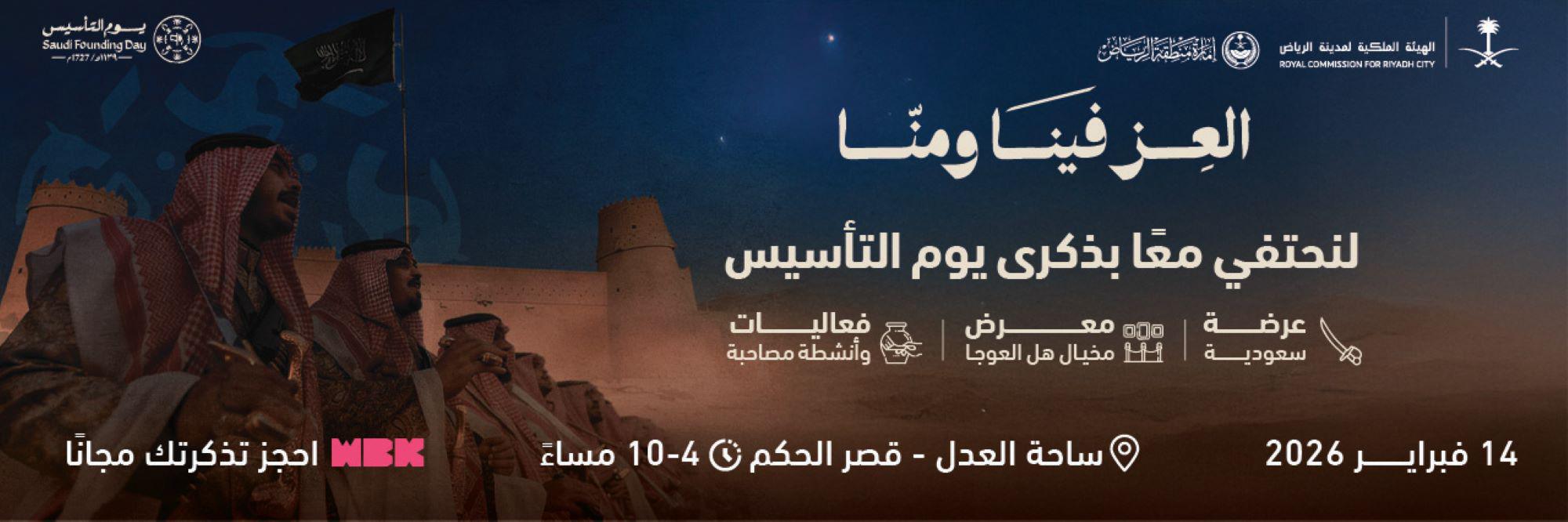 نلتقي في قصر الحكم لنستحضر ثلاثة قرون من العز والفخر، ونحتفي بأمجادنا عبر فعاليات تطلقها الهيئة الملكية لمدينة الرياض وإمارة منطقة الرياض. من إرثنا الشامخ الذي تُقرع له الطبول بالعرضة السعودية، ومعرض "مخيال هل العوجا" الذي يطل بنا على أمجاد التأسيس، كما تغمر عروض الإسقاط الضوئي واجهة قصر المصمك، وتتكامل رحلتنا بأنشطة وتفعيلات تفيض إبداعاً من مدرسة العرضة ومنطقة الصقور إلى الحرف اليدوية ومنطقة الطفل؛ لنحتفل معاً بمجدٍ ابتدأ من يوم بدينا.